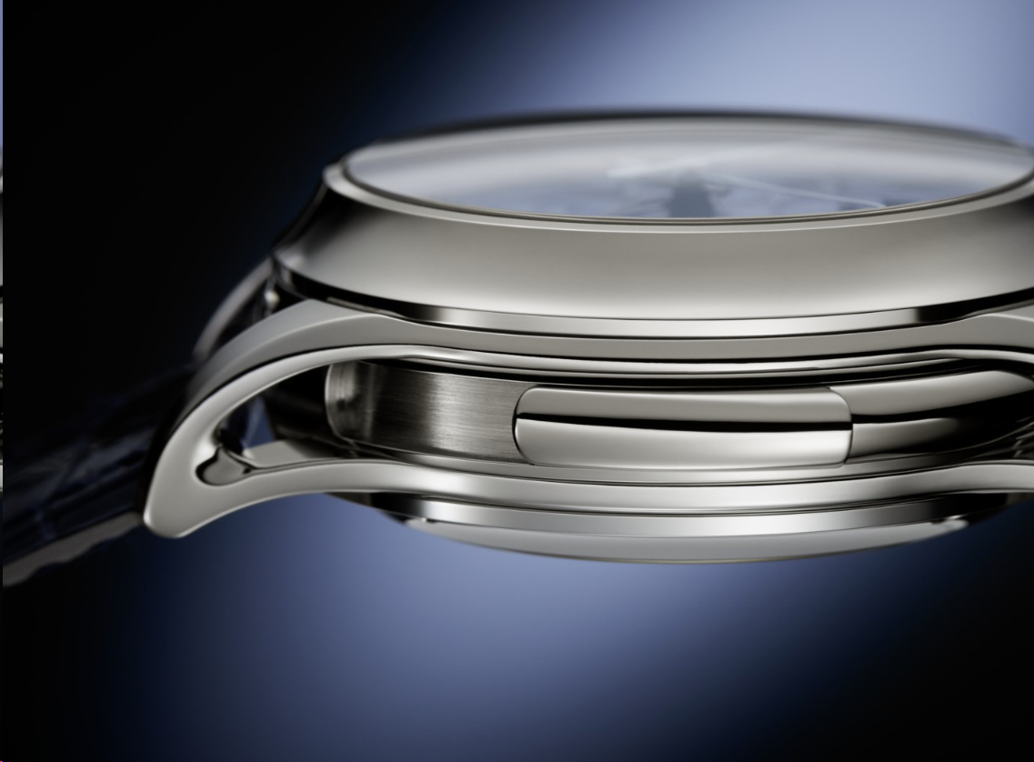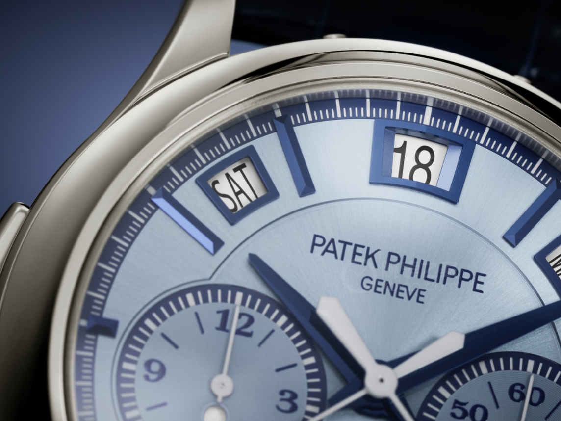 简介:新款四重复杂功能腕表 Ref. 5308G-001 配备优雅的冰蓝色日辉纹表盘,与蓝色金属喷镀处理的白金琢面立体时标和琢面剑形指针相得益彰。