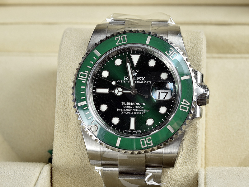 深邃的绿色看起来非常的漂亮,但是在搭配正装的时候不知道会不会有一些不合适呢,至少我个人认为这个颜色更加的适合运动和休闲类服饰,毕竟这款腕表是专门为潜水爱好者所设计的产品。表盘内圈刻有劳力士的防伪LOGO,外圈则是陶瓷材质刻度渐进式旋转外圈,可以随时查看减压时间。外壳和表链均采用了904L不锈钢材质,904L不锈钢有着非常强的耐腐蚀特性,适用于70℃以下各种浓度硫酸,在常压下耐任何浓度、任何温度的醋酸及甲酸与醋酸的混酸中的耐腐蚀性也很好。为潜水佩戴提供了有利的质量保证。 拔头上的劳力士标识也是劳力士产品重要的防伪方法之一,假冒产品由于制作工艺达不到这么高的水准经常做出来的LOGO由“开口笑”变成了“闭翳嘴”。不锈钢密底保证了在潜水时的抗压性,让您能够轻松的下潜300米,而不会影响正常的走时功能,这也是它的特性之一。