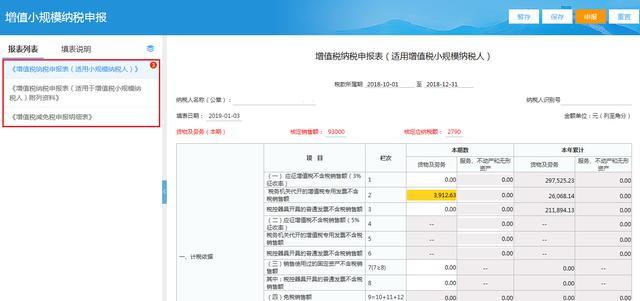 注:在选择申报表右上方标示的红色数字为警示信息,含义为该份申报表还存在的不能通过审核的错误数量。 五、 选择《增值税纳税申报表(适用于小规模纳税人)》 注:申报表上方显示应申报的增值税类型,核定征收的个体工商户同时显示核定销售额和核定应纳税额。 六、 《增值税纳税申报表(适用于小规模纳税人)》需填报的主要内容 注:因小规模纳税人不存在进项税额抵扣,所以在申报表主表中主要填写的就是五类销售额。 七、 应税销售额的填报