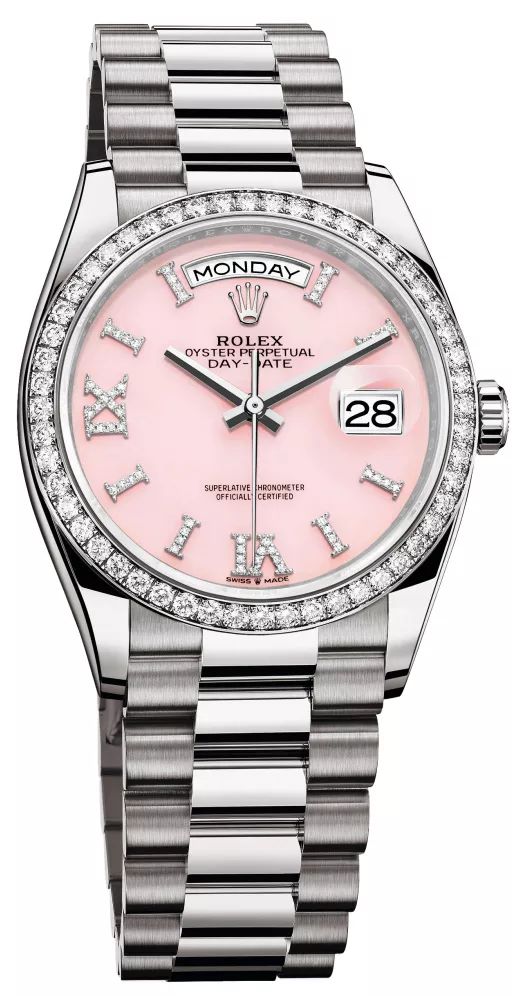 金款, 搭配渐变绿色表盘;另一款为18ct 永恒玫瑰金款, 搭配渐变棕色表盘。两者皆缀以18ct 金镶钻钟点标记;6 点钟及9 点钟位置镶嵌2 颗方形钻石,此乃星期日历型系列特有设计。另有二款分别为18ct 白色黄金款及18ct 黄金款,分别搭配粉红色蛋白石表盘及绿松石表盘,18ct 金镶钻钟点标记及罗马数字VI 与 IX,外圈镶嵌 52 颗钻石,光彩照人,熠熠生辉。最后一个新款为18ct 白色黄金款,更显珍贵。密镶钻石表盘,配10 颗方形彩虹渐变色蓝宝石钟点标记。靓丽外圈镶52 颗圆形钻石,表带中间链节密镶412 颗圆形钻石。表壳及表耳两侧折射出淡雅光泽,令36 毫米蚝式表壳的轮廓更突出,倍添魅力。所有新款均搭载制表技术领先的 3255 型机芯,这也是蚝式恒动星期日历型 36 首次搭载此款机芯。一如所有劳力士腕表,新款蚝式恒动星期日历型36 均获超卓天文台精密时计认证,保证腕表于佩戴时能发挥超卓性能。